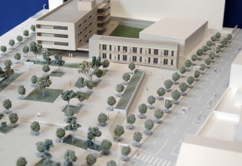 Aquesta maqueta presenta la volumetria i els colors i textures dels materials detallats al projecte, alhora que ubica el nou equipament al seu emplaçament concret de Figueres, destacant el parc municipal amb què es relaciona urbanísticament i que aporta un valor afegit al projecte.